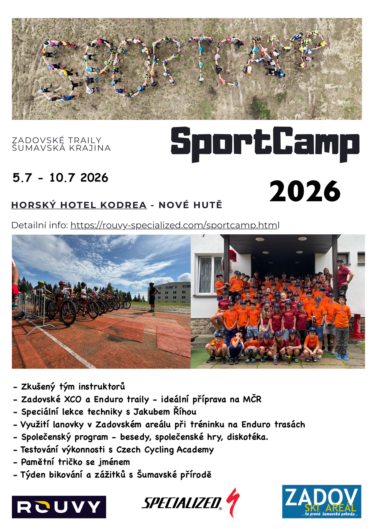 Děti na SportCampu zažijí týden plný cyklistiky, zábavy a přátelství. Budou se učit od lidí, z nichž někteří ještě nedávno figurovali na startovce Českého Poháru. Seznámí se se základy tréninku na horském kole v disciplíně cross-country. I v roce 2026 se budeme během kempu soustředit zejména na vylepšení technických dovedností. A to ve skvělém tréninkovém prostředí zadovských tratí pro XC a Enduro.